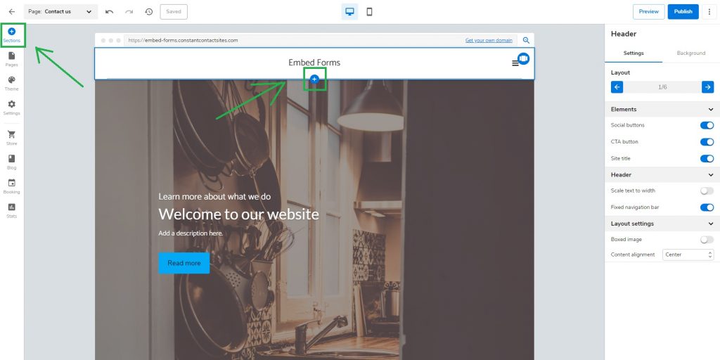 Step 2) In your Constant Contact account, access the editor of the website where you want to add your web form and navigate to your desired webpage. Then just click on Add New Section.