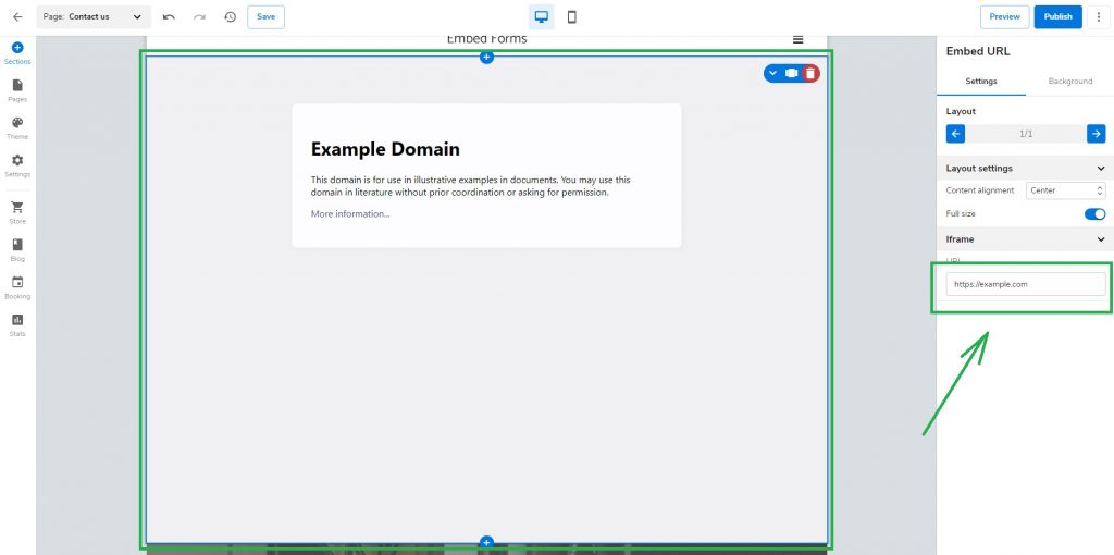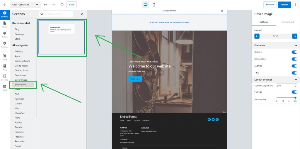 Step 3) In the sections menu choose the Embed URL section and then click on the section element preview to add it to your page.