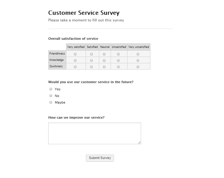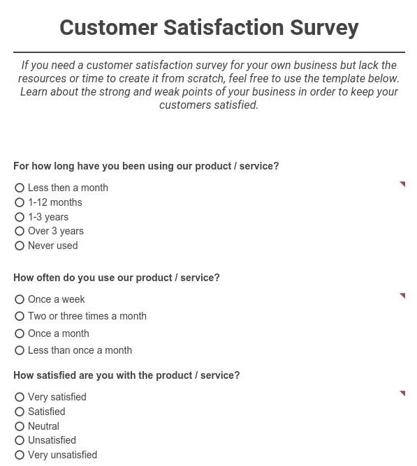 Measuring customer satisfaction is incredibly important because satisfaction is a strong predictor of future behavior (e.g. the probability of buying again and/or the probability of your customers referring to others). You can find bellow some essential customer satisfaction questions examples.