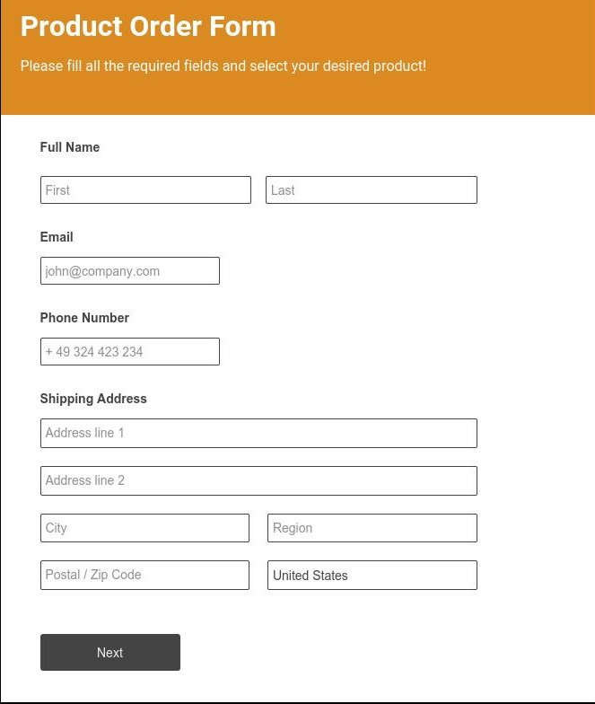 Choose one of our t-shirt order form examples to create your own custom t-shirt order form and start selling online in minutes. Any order forms can be integrated with payment gateways like Stripe Checkout, PayPal Checkout, Braintree Checkout, Square and cash on delivery(COD).