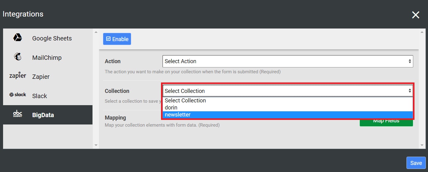 On this step, you must choose the collection in which you want to save your form data. If you don’t have a collection yet, click here to learn how to create one.