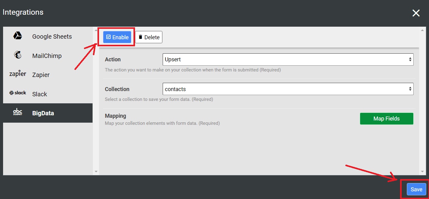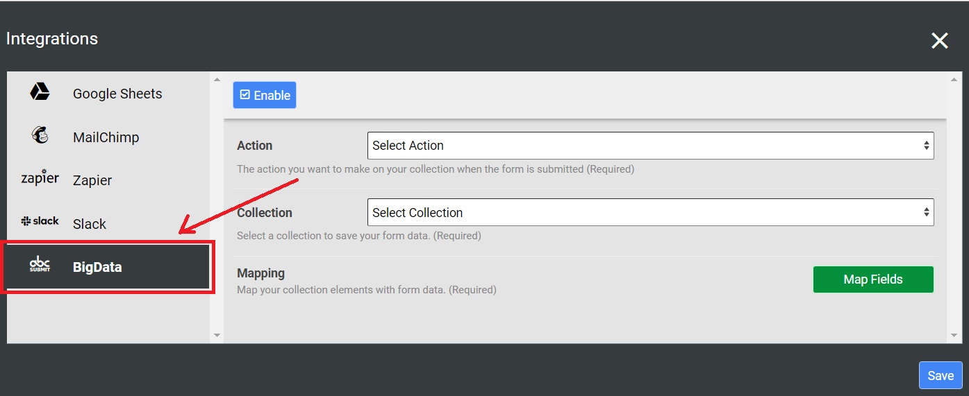 After all your BigData Integration options were managed, in order to use your integration, you must click the Enable button to enable your integration and then click the Save button.