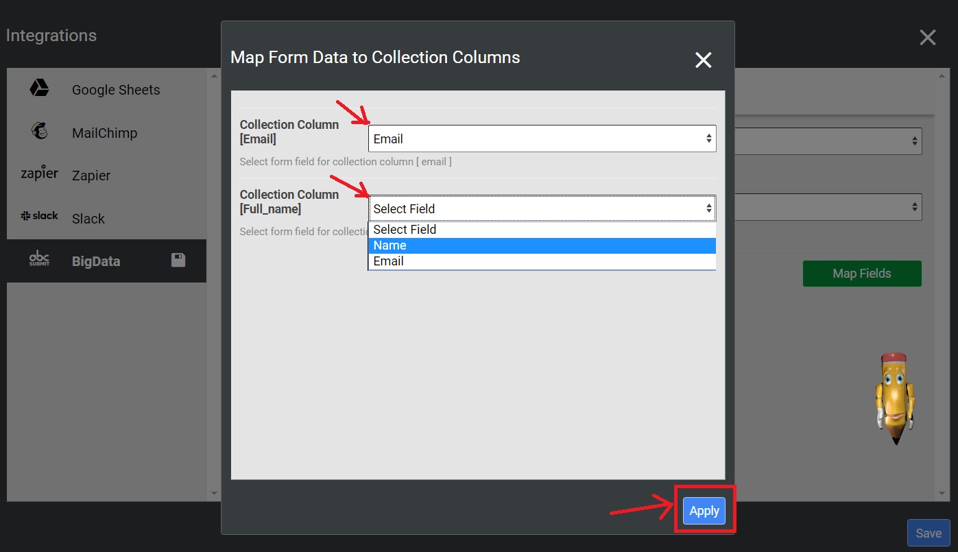 Choose the right form fields for your collection columns and then click the Apply button.