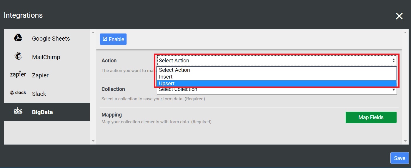 Note: If you choose the Insert action and you have a unique index on a column in your collection and someone submits your form again with the same value for the unique column, your form data won’t be saved due to duplicate entry. If you have a use case where you want to update an existing row in your collection when someone submits your form with the same details(Eg: same email address), you have to choose the Upsert action.