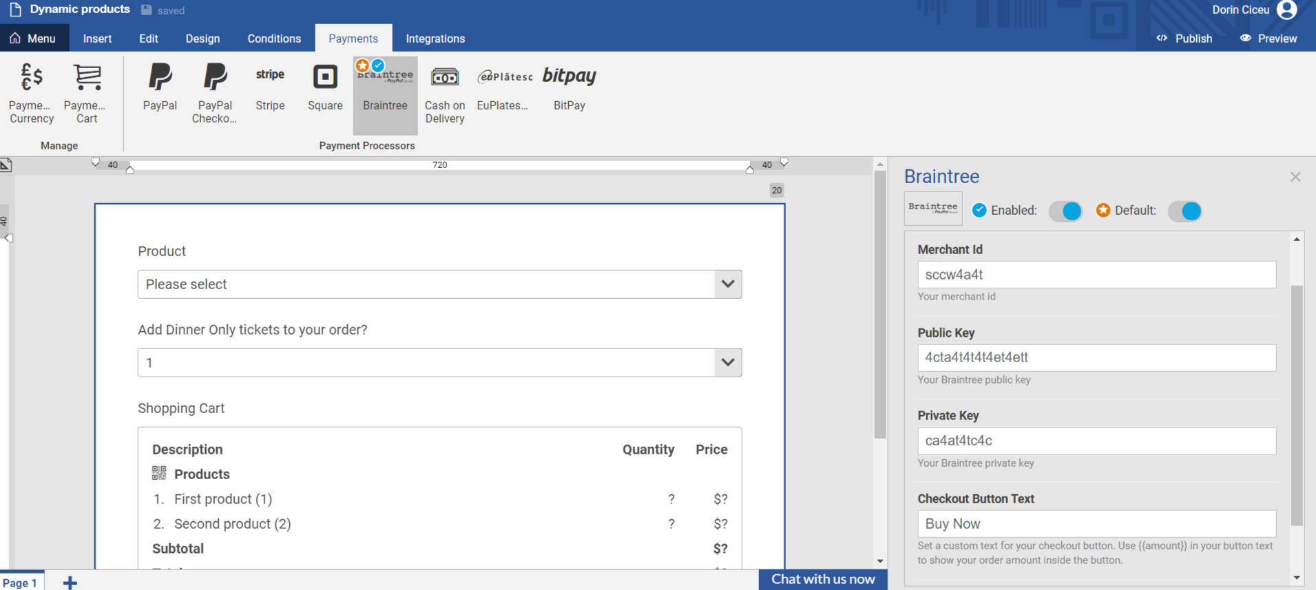 4. In the Payments ribbon, click on Braintree integration and add your Braintree Merchant Id, Public Key, and Private Key.